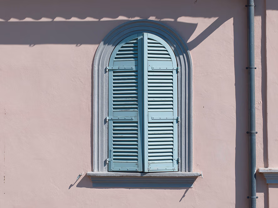 Die ursprünglichen Holzfensterläden mit abgeschrägten Lamellen in einem spezifischen Grünton waren stark gealtert. Um die Fassadenästhetik zu erhalten, fiel die Wahl auf das EHRET Modell Paris mit abgeschrägten Lamellen im Farbton RAL 6019. Jeder Fensterladen wurde millimetergenau gefertigt, wobei die Lamellen passgenau an die Rundungen der historischen Bogenfenster zugeschnitten sind.