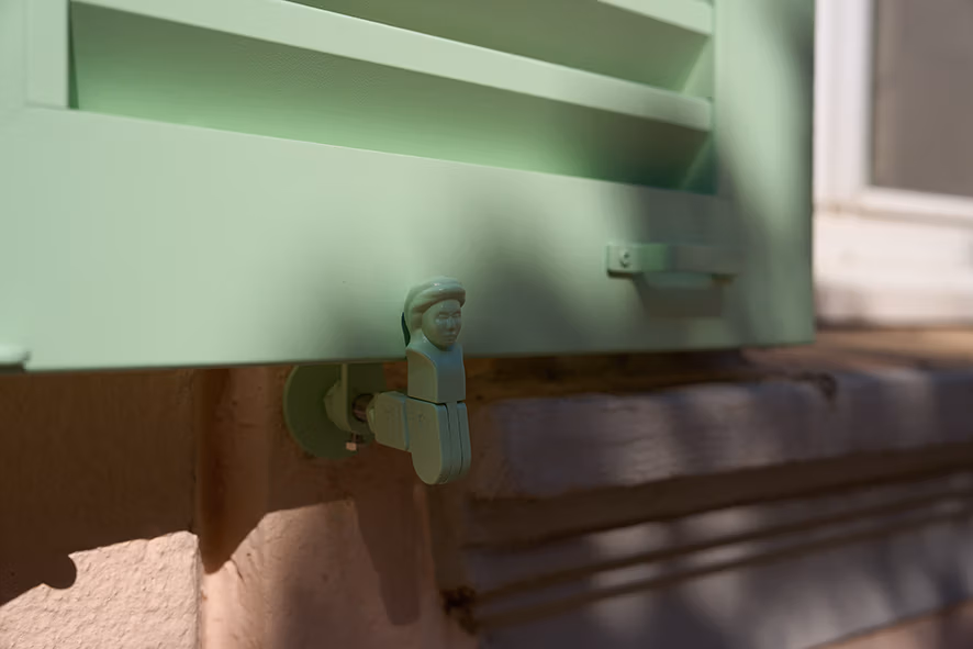 Als einer der wenigen Hersteller kann EHRET durchbrochene Lamellen passgenau für gewölbte Fenster fertigen und somit die charakteristische Ästhetik erhalten. Für ein stimmiges Gesamtbild wurden auch die Zubehörteile wie Frauenköpfe, Scharniere und Befestigungen im selben Farbton lackiert.