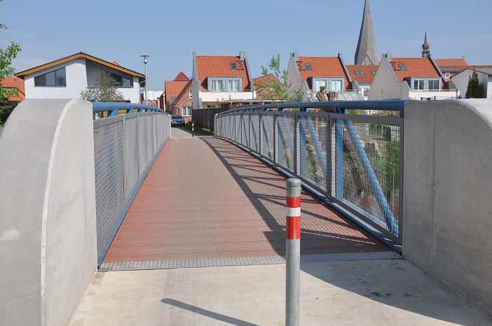 Die zu erneuernde 25 m lange und rund 2,8 m breite Brücke, somit also eine Fläche von rund 70 m², wurde mit den TRIMAX® – Belagsbohlen 5 x 30 cm im Farbton rotbraun belegt. Die Unterkonstruktion wurde mit Bohlen des gleichen Fabrikates, jedoch mit den Profilabmessungen 5 x 10 cm im Farbton grau gebaut. Die im niedersächsischen Fresenburg ansässige Schmees & Lühn GmbH & Co. KG errichtete diese wunderschöne Brücke