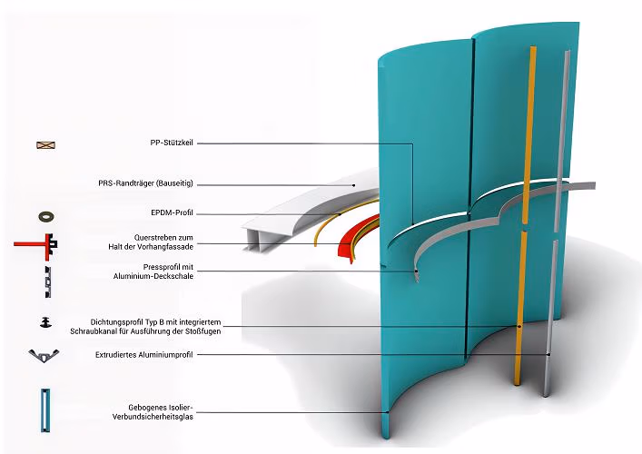 Die gebogene Fassadengeometrie erzeugt eine hohe Abhängigkeit zwischen den einzelnen Bauteilen.