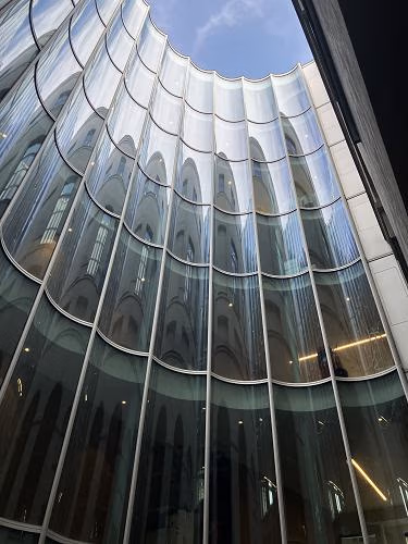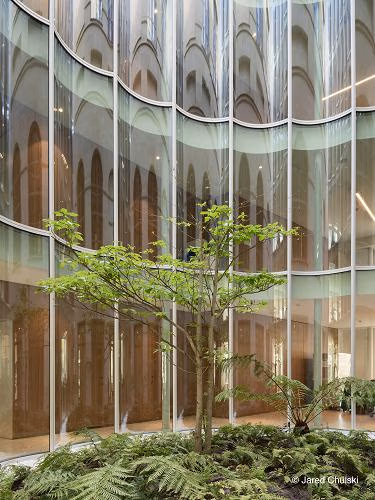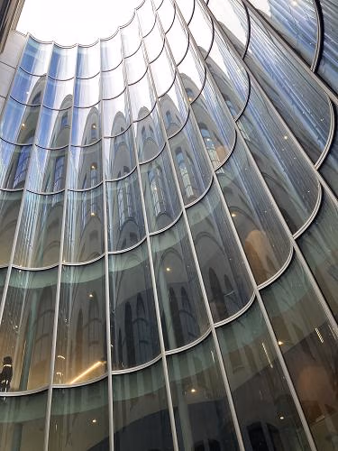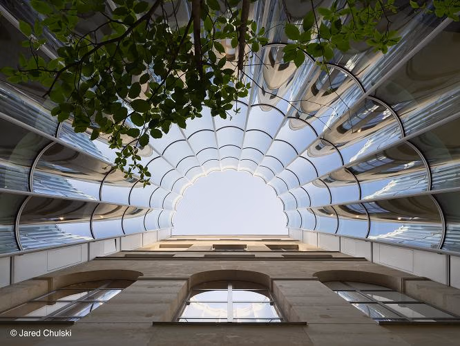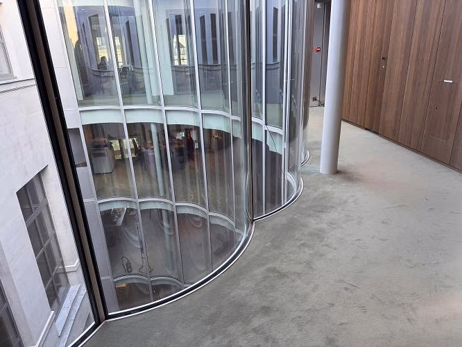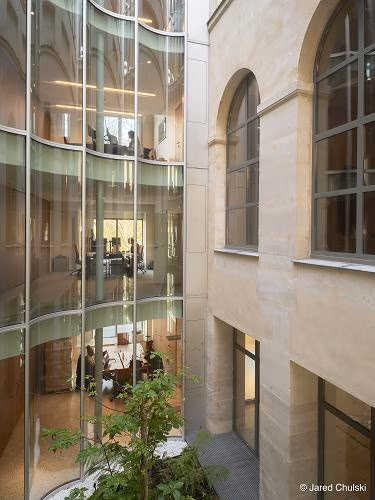Im Innenhof entstand dazu eine halbmondförmige Glasfassade. Sie verbindet historische Bausubstanz mit modernen Arbeitsbereichen und erstreckt sich vom Erdgeschoss bis in das sechste Obergeschoss.