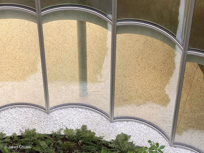 Die Vorhangfassade umfasst insgesamt 77 gebogene Isoliergläser mit einer Gesamtfläche von rund 305 m².