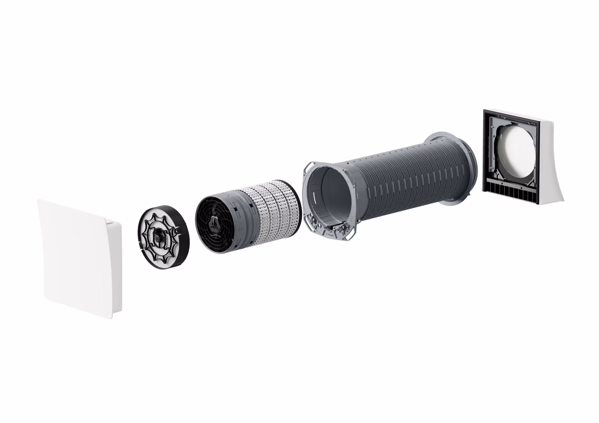 Das Teleskopgehäuse besteht aus einzelnen Segmenten, die durch einen Bajonettverschluss miteinander verbunden sind. Dadurch lässt sich das Lüftungsgerät flexibel und ohne Werkzeug an verschiedene Wandstärken anpassen. Ein weiteres Highlight ist das neue automatische Schaumsystem: Über die Einschäumöffnung auf der Raumseite wird der Bauschaum automatisch bequem und gleichmäßig um das Gerät herum verteilt.