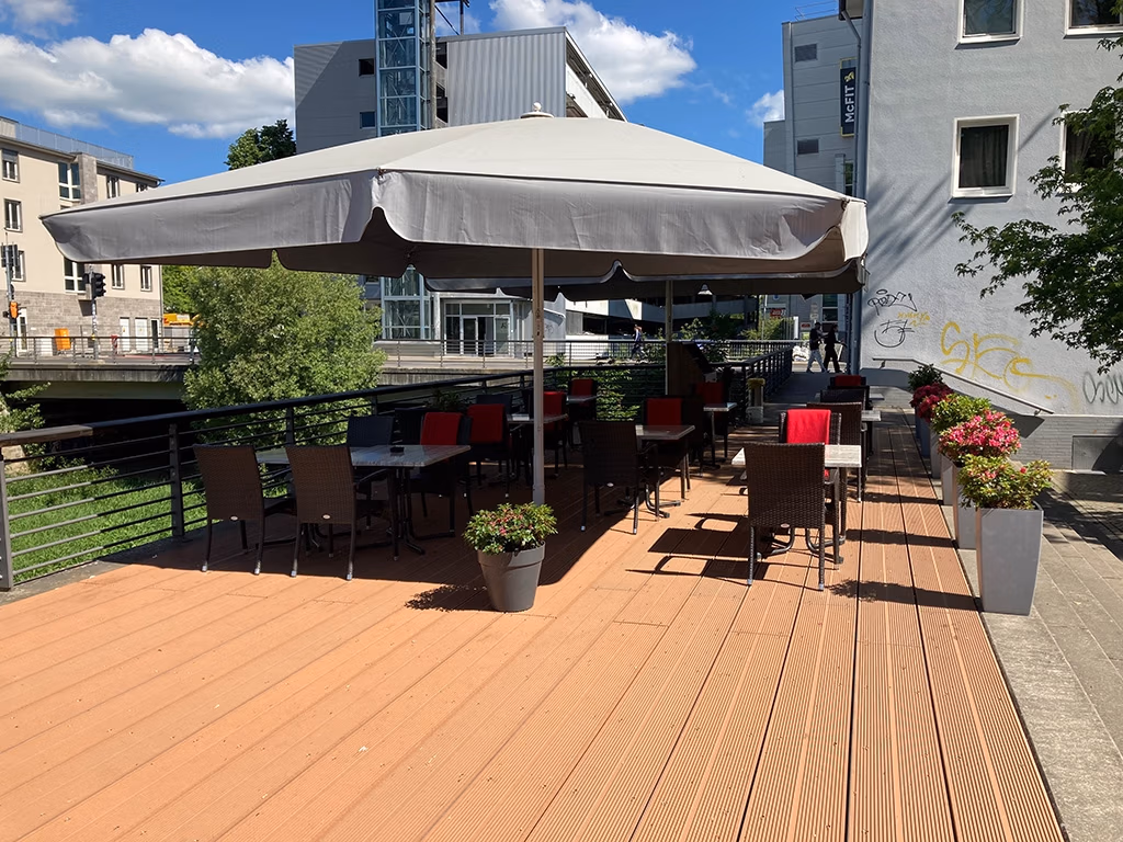 TRIMAX Terrassenbelag für neue Gastroterrassen in Siegen: Recycling-Kunststoff ersetzt schadhafte Holzkonstruktion